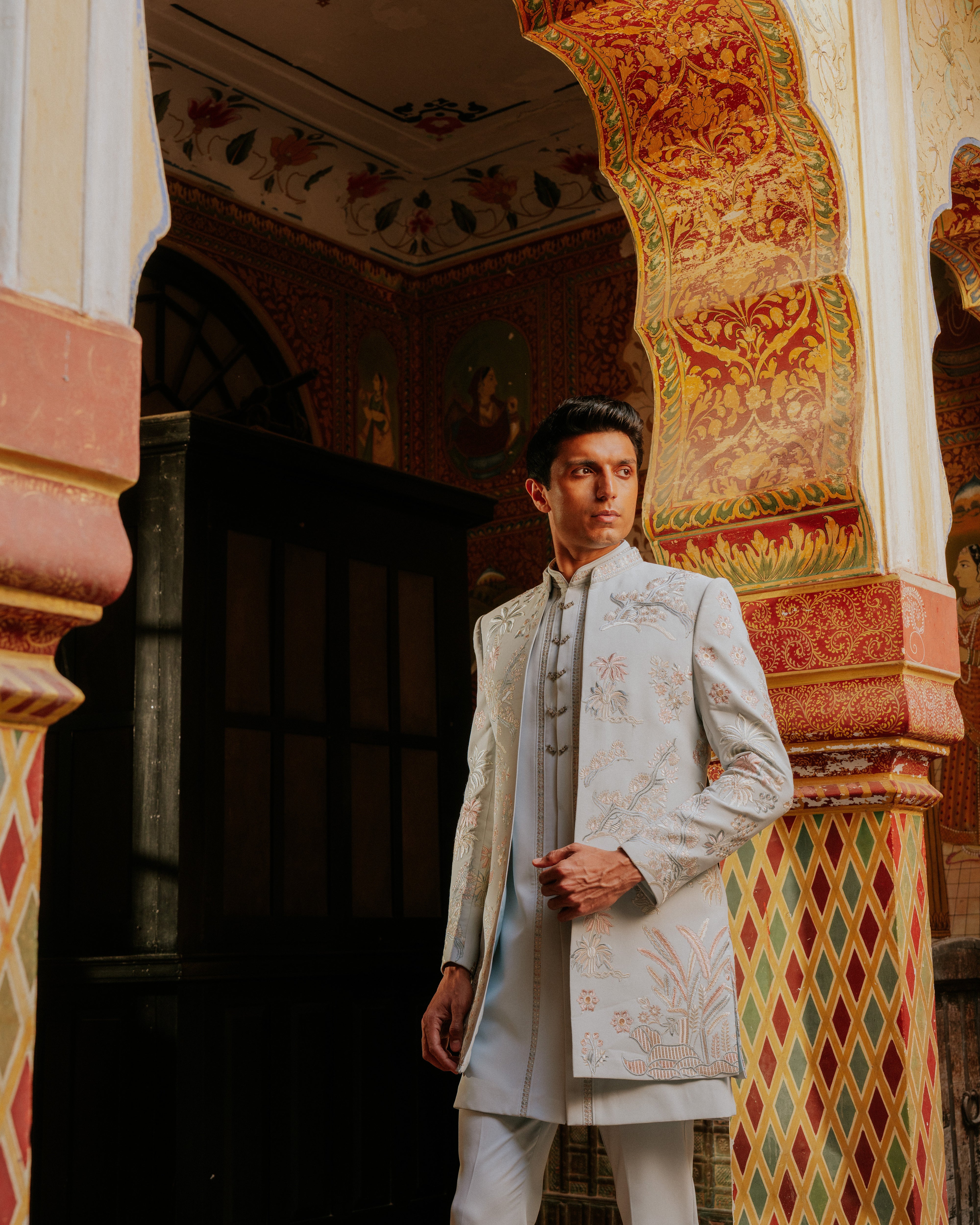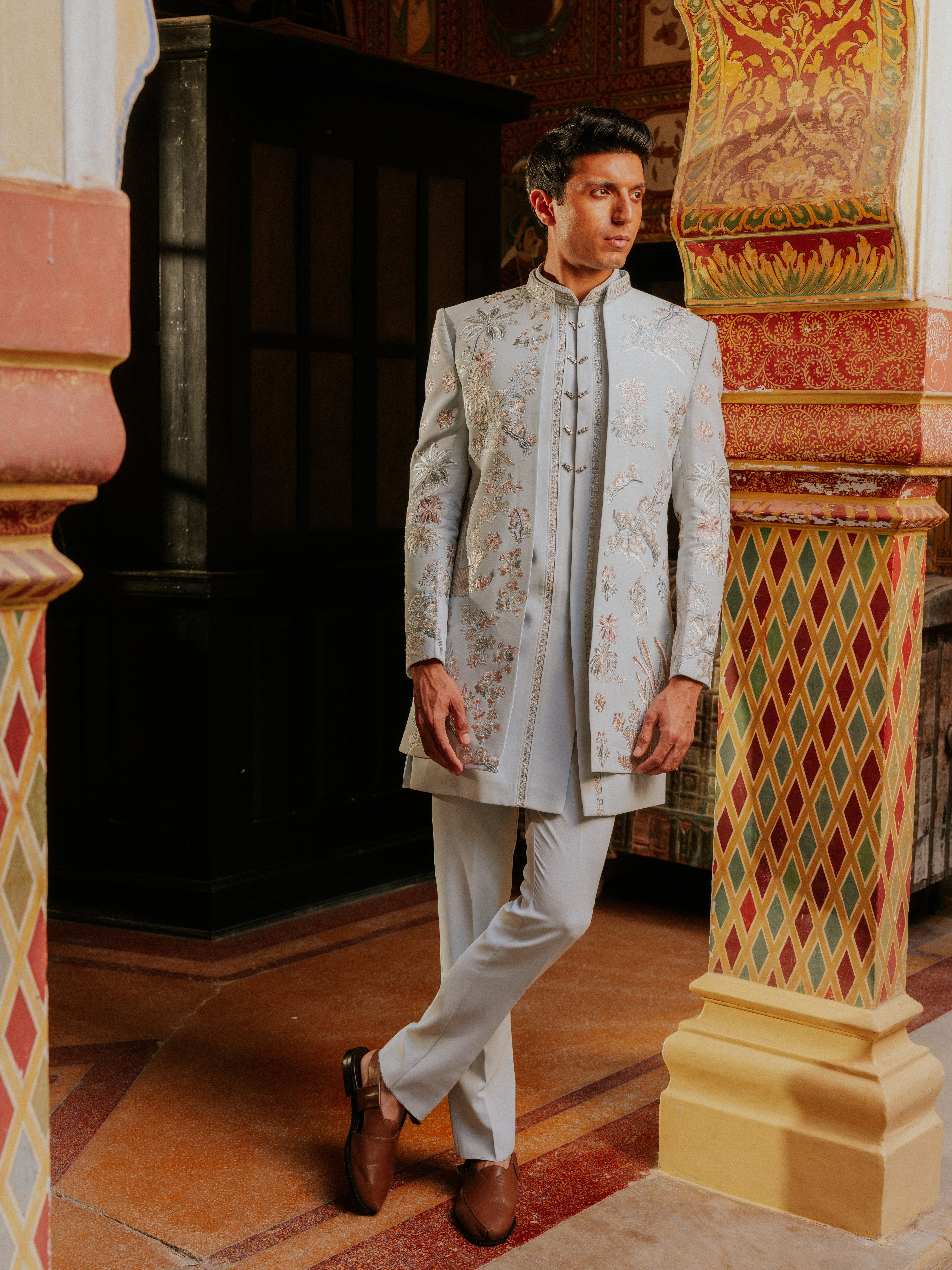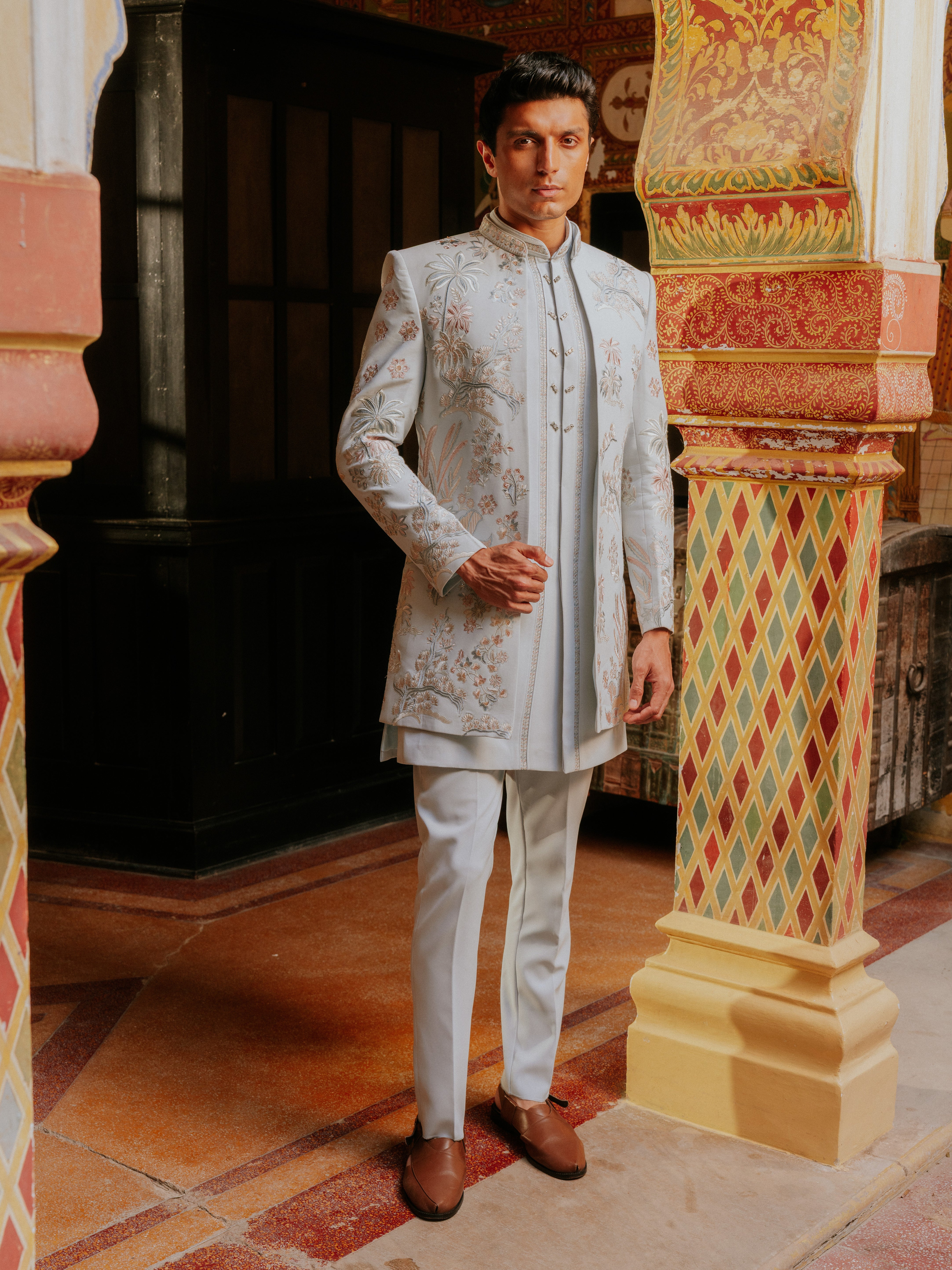 Stand out with our Petal Sky Shrug Indo Western crafted for the modern man who embraces heritage with style. This striking fusion piece adds a sophisticated cultural flair to the Western silhouette, making it an essential for every special occasion.