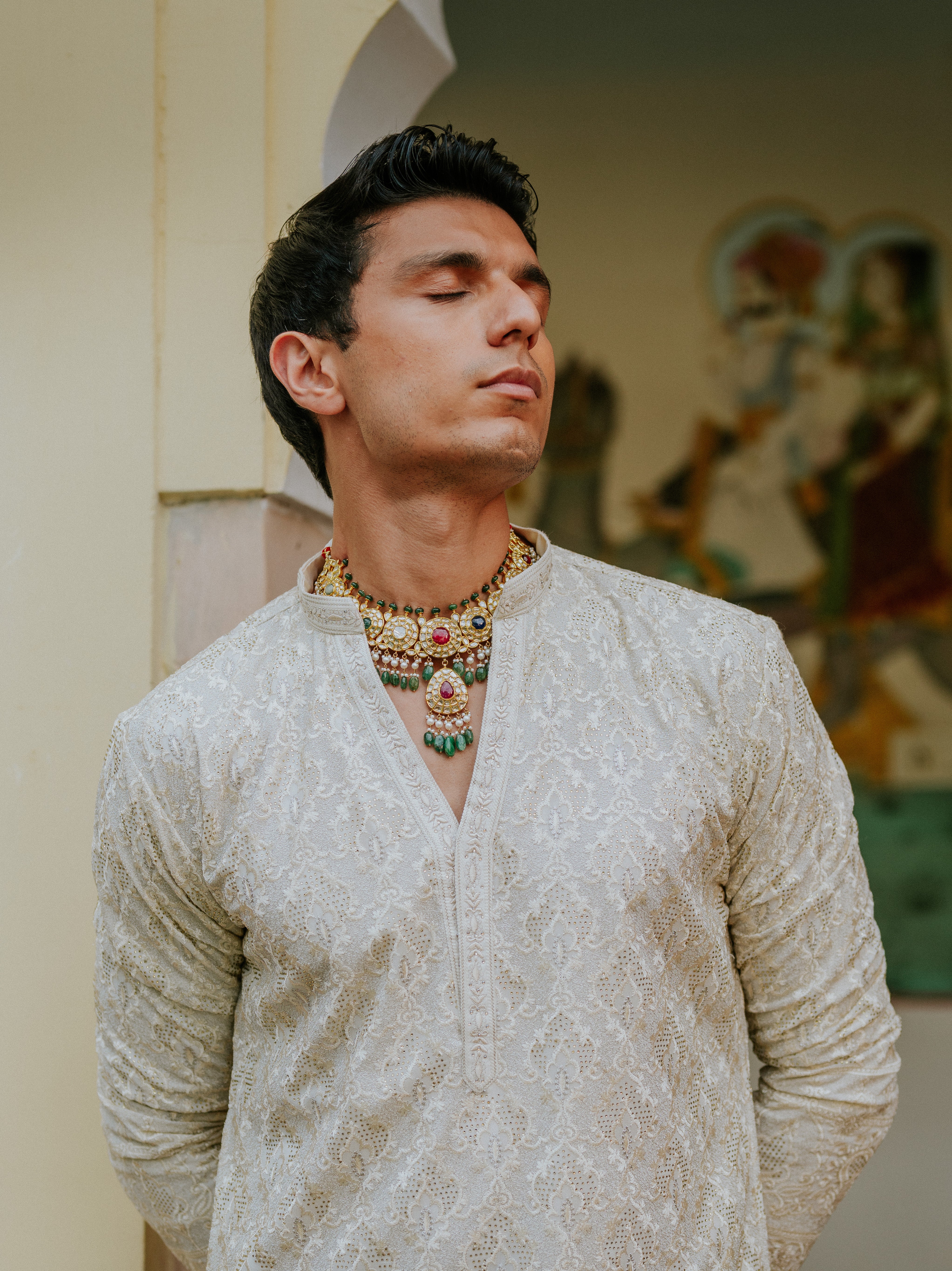 Our Rajwada Cream Kurta Set embodies the grace of Indian charm, making it ideal for your festive events. Bring a splash of rang and elegance to your wardrobe with intricate sequin work that promises to make you the center of attention at every jashn.